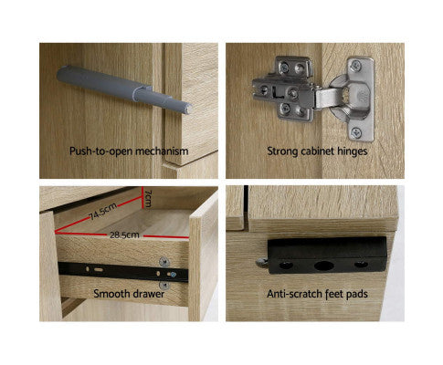 The large drawer and push-to-open cabinets are handle-less to maintain a sleek appearance and provide ample storage for all your home essentials. The sideboard is built to last with 15mm thick melamine particle boards with PVC edging, strong cabinet hinges, smooth drawer runners and anti-scratch feet.
