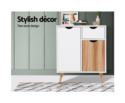 A design that is Scandinavian-inspired and yet reminiscent of decades-old influences, our Buffet Sideboard offers full functionality with stylish cues. Made from quality particle board with smooth melamine finish, the two-tone buffet sideboard adds some chic appeal to your decor and is the perfect choice to grace any dining room, kitchen, living room or any other space in a discerning home or establishment. The splayed legs add a unique stance to this very able buffet sideboard that also comes with cut-out handles, smooth anti-rust drawer runners, sturdy cabinet hinges and floor protectors for hassle-free use. Not least, ample storage is found with the wide top, one drawer and three shelf spaces behind closed doors, to display all your collectibles or decorations and store all your crockery or tea towels.